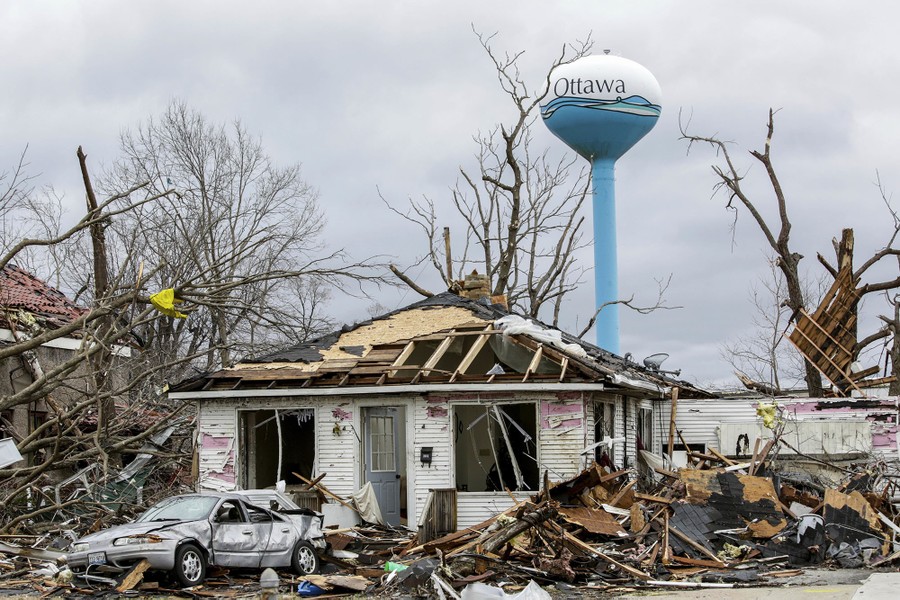 Read moreDebbie Loughridge's damaged home and car are seen among debris in Naplate, Illinois, on March 1, 2017. Loughridge and her son rode out the storm in the bathtub. "All I heard was the wind and the breaking glass. Like an explosion of glass," she said. In the small community of Naplate, next to Ottawa, about a quarter of the roughly 200 homes were damaged, Fire Chief John Nevins said. #