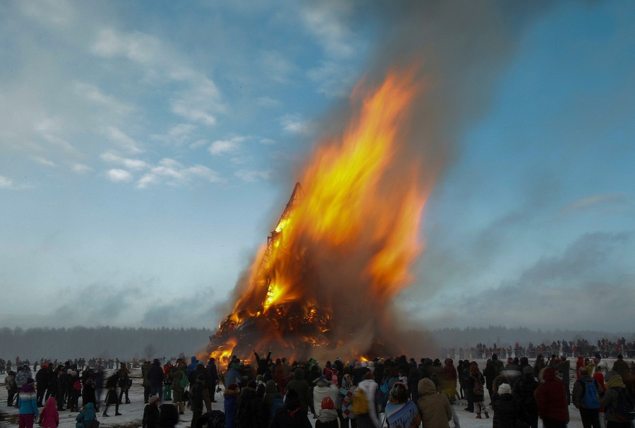 Read moreSpectators look at a burning installation during the performance devoted to Maslenitsa, or Pancake Week, a pagan holiday marking the end of winter in the village of Nikola-Lenivets, Kaluga region, Russia, on February 25, 2017. #