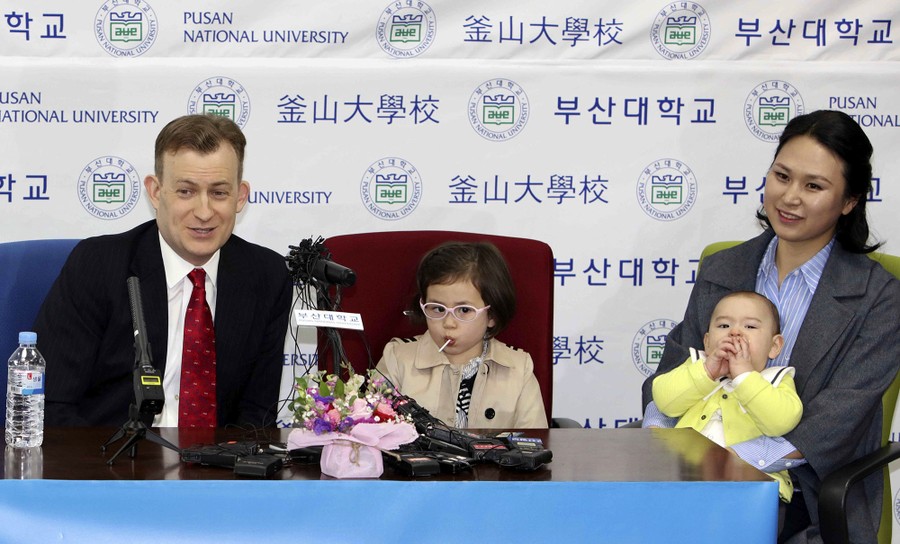 Read moreRobert Kelly, left, a political science professor at Pusan National University, holds a press conference with his wife Jung-a Kim, right, and children Marion (center) and James at the university in Busan, South Korea, on March 15, 2017. In a video that went viral this week, Kelly spoke from his home office via Skype with BBC about the just-ousted South Korean President Park Geun Hye, when his young daughter and son paraded into the room behind him. #
