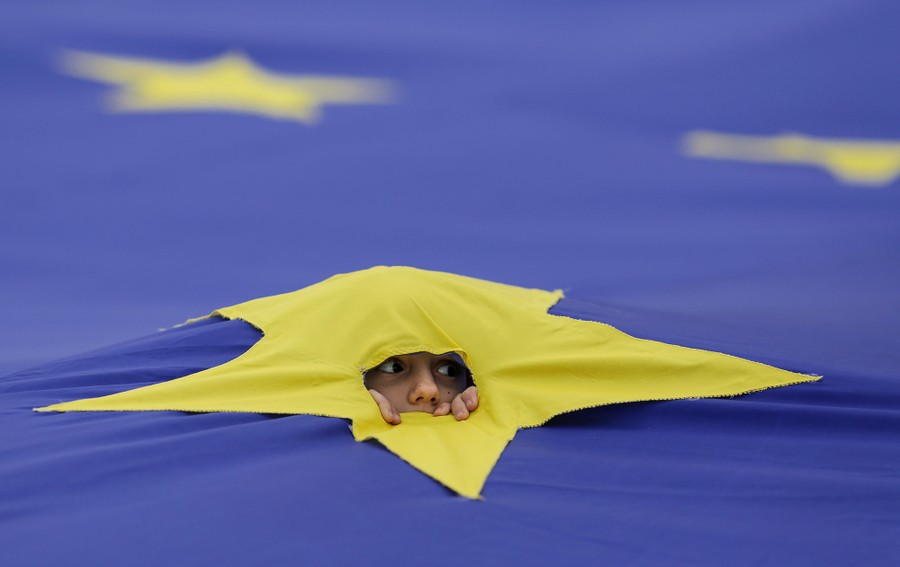 Read moreA child peers through a hole made in one of the stars that make up the European Union flag, during a support rally organised to mark the EU's 60th anniversary of the Treaty of Rome in downtown Bucharest, Romania, on March 25, 2017. #
