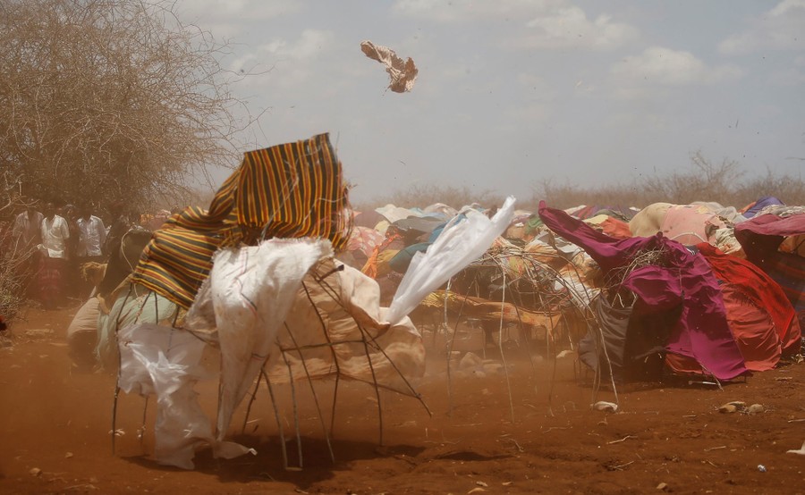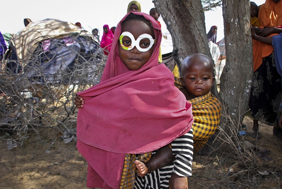 Read moreA young Somali girl who was displaced by the drought wears a pair of mock spectacles cut out from a cardboard box of antibiotics medicine as a joke, as she carries her brother around a camp just outside of Mogadishu, Somalia on March 28, 2017. Somalia's drought is threatening 3 million lives according to the U.N. and in recent months aid agencies have been scaling up their efforts but say more support is urgently needed to prevent the crisis from worsening. #