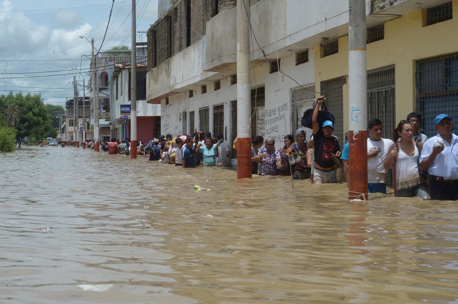 Read moreResidents cross a flooded street after rivers breached their banks due to torrential rains, causing flooding and widespread destruction in Piura, Peru, on March 27, 2017. #