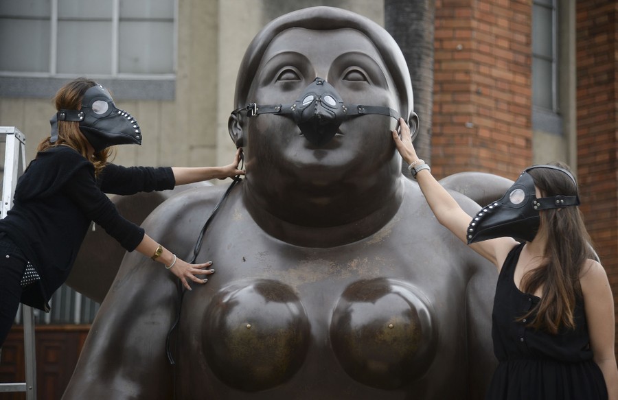 Read moreProtesting environmentalists wearing mock gas masks place a mask on the face of the sculpture "Esfinge" (Sphynx), by Colombian artist Fernando Botero, at Botero Park in Medellin, Antioquia department, Colombia, on March 29, 2017, after the city authorities declared an environmental emergency due to high pollution levels. #