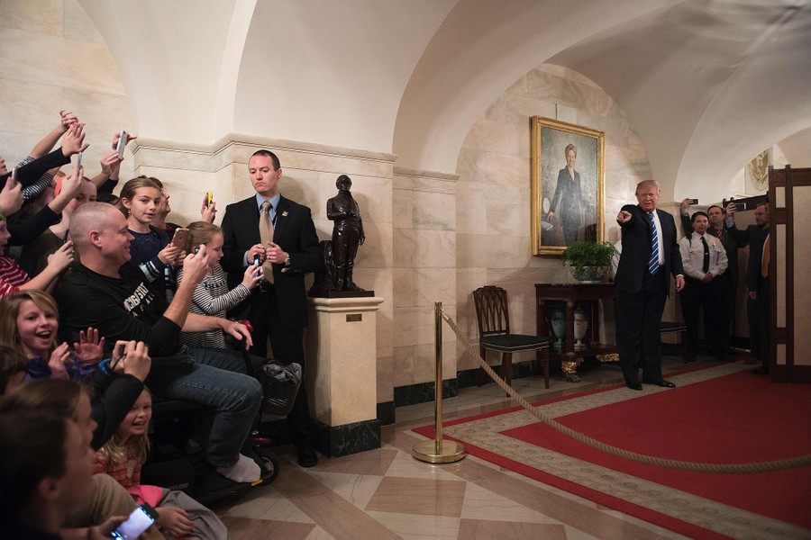 Read morePresident Donald Trump points to a child in the crowd as he surprises visitors during the official reopening of public tours at the White House in Washington, DC, on March 7, 2017. #