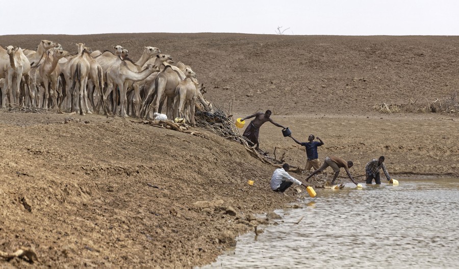 Read moreCamel herders scoop up water in plastic buckets from one of the few watering holes in the area, to water their animals near the drought-affected village of Bandarero, northern Kenya, near Moyale town on the Ethiopian border, on March 3, 2017. The U.N. humanitarian chief, Stephen O'Brien, toured Bandarero on Friday and called on the international community to act to "avert the very worst of the effects of drought and to avert a famine to make sure we don't go from what is deep suffering to a catastrophe." #
