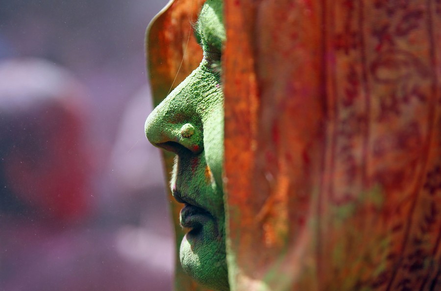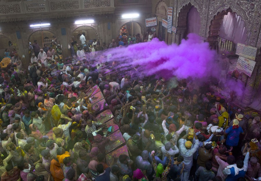 Read moreHindu priests throw colored powder at devotees inside Banke Bihari temple, dedicated to Lord Krishna, during Holi festival celebrations in Vrindavan, India, on March 8, 2017. #