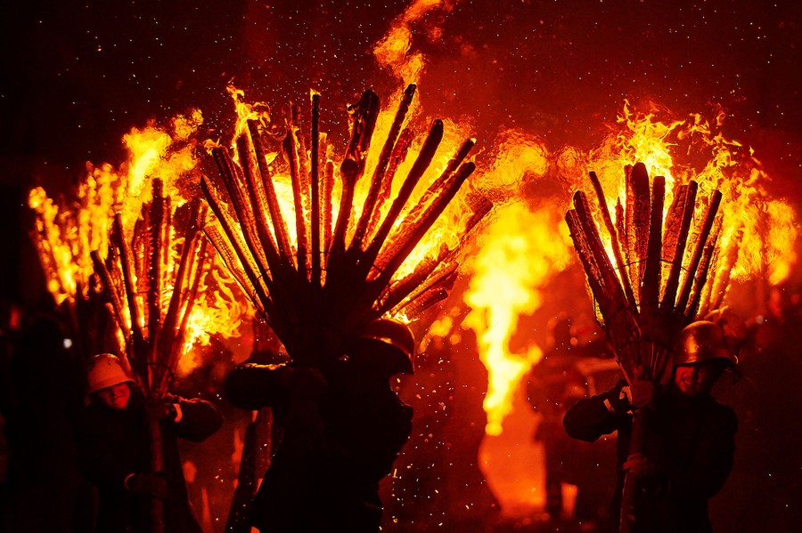Read morePeople carry burning bundles of pinewood chips on their shoulders during the "Chienbase" procession on March 5, 2017 in Liestal, northern Switzerland. The procession takes place on the Sunday night after Ash Wednesday through the medieval town center. On this occasion, hundreds of people carry burning bundles of pinewood chips (called Chienbase, the Swiss German word for 'pinewood besom') #