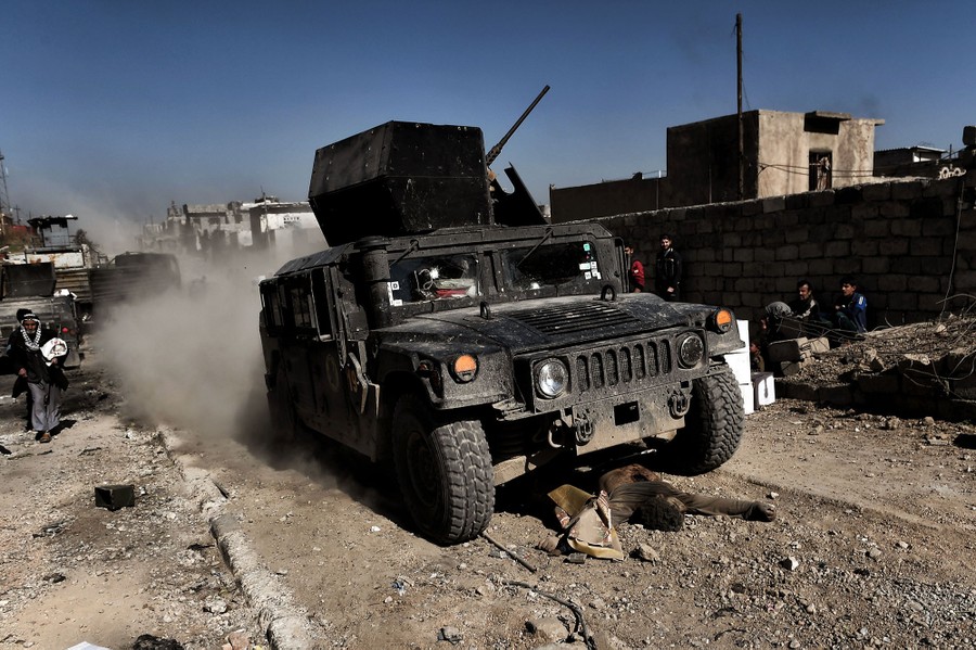 Read moreA Humvee passes over the body of an ISIS jihadist lying in a street in west Mosul on March 10, 2017 as Iraqi forces advance in the city in the ongoing battle to seize it from ISIS. #