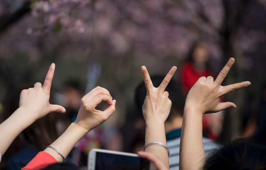 Read moreVisitors form the word 'LOVE' with their hands in front of a cherry blossom tree in Gucun Park in Shanghai on March 4, 2017. Every year the cherry blossoms in this park attract hundreds of thousands of visitors. #