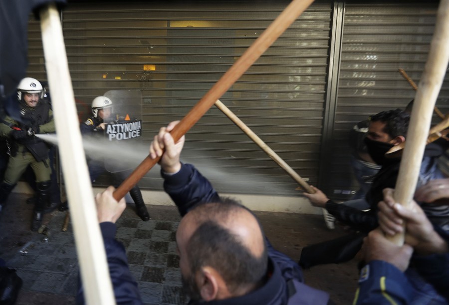 Read moreRiot police use pepper spray against protesting farmers during clashes outside the Agriculture Ministry, in Athens, Greece, on March 8, 2017. Several hundred farmers from the island of Crete are protesting against government tax reforms tied to the country's international bailout. #