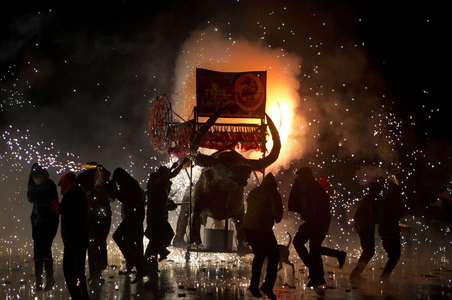 Read moreYoung people run amidst fireworks exploding off of a wheeled paper bull rigged with pyrotechnics, during the annual pyrotechnics fair in Tultepec, on the outskirts of Mexico City, on March 8, 2017. Two months after an explosion tore through the Tultepec fireworks market, killing 42, the town honored its patron saint San Juan de Dios in its usual exuberant style, by exploding hundreds of colorful bulls elaborately rigged with fireworks in a field and the packed town square. #