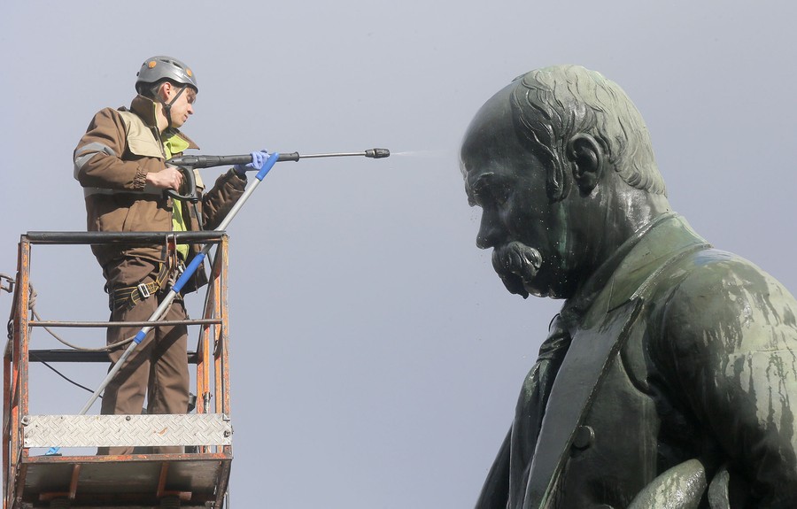 Read moreA worker cleans a monument to famed Ukrainian poet Taras Shevchenko in Kiev, Ukraine, on March 7, 2017. The monument was installed in 1939 and has become one of the dramatic symbols of the capital city. #