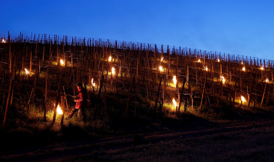 Read moreWine-grower Daniel Grab stands between burning paraffin fire pots he uses to protect the vines against freezing temperatures at his vineyard in Adlikon, Switzerland, on April 20, 2017. #