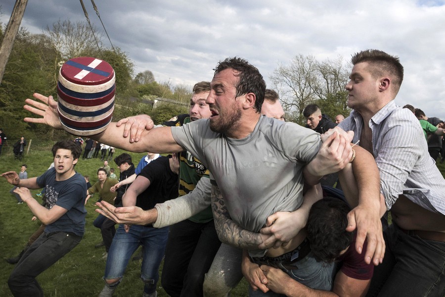 Read moreThe second round of the Bottle Kicking gets underway over the Hare Pie Hill on April 17, 2017 in Hallaton, England. Hallaton hosts the Hare Pie Scramble and Bottle Kicking event today. The Bottle Kicking follows the Hare Pie Scramble, two events that are combined to form an ancient custom that dates back to the early eighteenth century, and one of the oldest in British History. The first part consists of a blessing of a Hare Pie by a local vicar, before it is cut up and thrown to the crowd, who 'scramble' to get a piece, believing it will bring good luck. The second part, the Bottle kicking sees two rival villages, Hallaton, and neighboring Medbourne attempt to carry a 'bottle' which is actually a keg of beer, from the Hare Pie Bank, and get it across a boundary stream for their own village. The best of three contest can last several hours. #