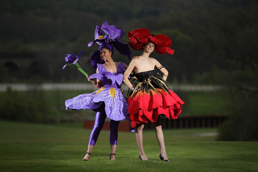 Read moreModels Lauren Green (left) and Abi Moore pose for photographers as they wear an Iris and Poppy flower gowns designed by New Zealand artist, Jenny Gillies on April 19, 2017 in Harrogate, England. The flower gowns are just some of the many dresses being displayed at this year's Harrogate Spring Show between April 20-23 2017. #