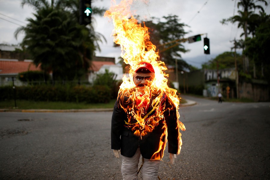 Read moreAn effigy depicting Venezuela's President Nicolas Maduro is set alight during the traditional burning of Judas as part of Holy Week celebrations, at a street in Caracas, Venezuela, on April 16, 2017. #