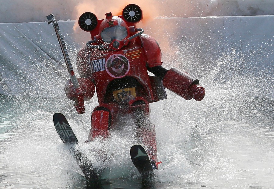 Read moreA skier in a costume attempts to cross a pool of water at the foot of a ski slope while competing in the annual "Gornoluzhnik" amateur event marking the end of the ski season, at the Bobrovy Log ski resort in the suburbs of the Siberian city of Krasnoyarsk, Russia, on April 16, 2017. #