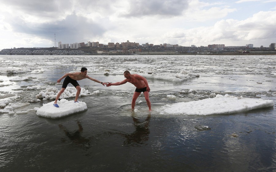 Read moreMembers of the "Yenisei walruses" winter swimming club, Alexander Alexandrov (right), 39, and Konstantin Kindinov, 15, step from one floe to another during an ice drift on the Yenisei River in Krasnoyarsk, Russia, on April 18, 2017. #