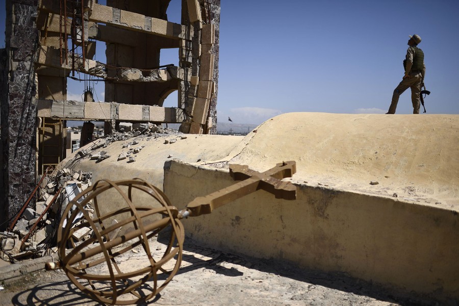 Read moreA Syrian Christian militiaman stands guard on top of the Saint John's church (Mar Yohanna) during an Easter procession in the nearly deserted predominantly Christian Iraqi town of Qaraqosh (also known as Hamdaniya), some 30 kilometers from Mosul, on April 16, 2017. Qaraqosh was retaken by Iraqi forces late in 2016 as part of a massive offensive to wrest back the nearby city of Mosul from ISIS fighters but it remains almost completely deserted. #