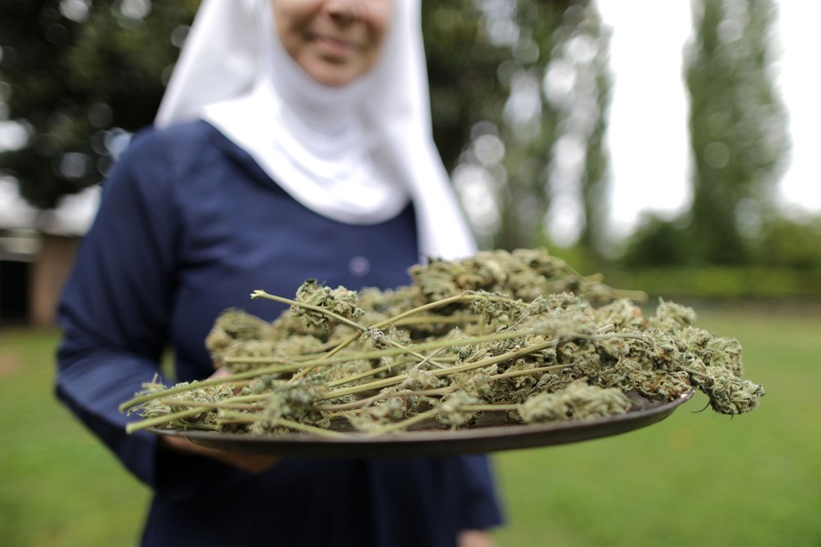 Read moreCalifornia "weed nun" Christine Meeusen, 57, who goes by the name Sister Kate, carries a plate of hemp at Sisters of the Valley near Merced, California, on April 18, 2017. #