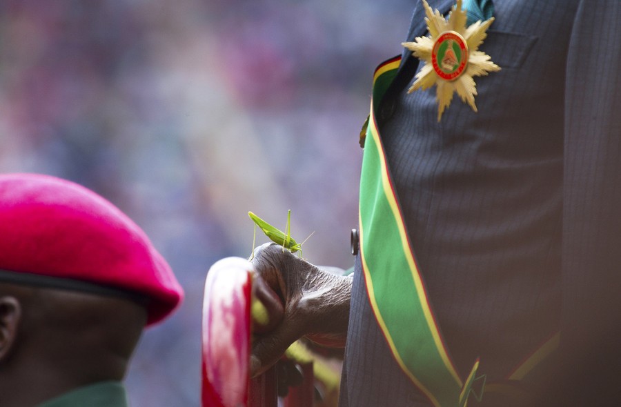 Read moreA grasshopper sits on Zimbabwean President Robert Mugabe's hand as he inspects the guard of honor during the country's 37th Independence celebrations in Harare, on April, 18, 2017. #