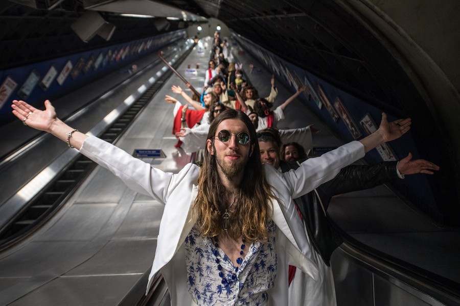 Read moreRevelers travel on a escalator on the London underground at Waterloo station during the Christathon X pub crawl on April 16, 2017 in London, England. The Christathon pub crawl is celebrating its tenth year this year and sees participants dress as Jesus and visit pubs on Easter Sunday around the British capital while donating collections from those involved to the charity Save the Children. #