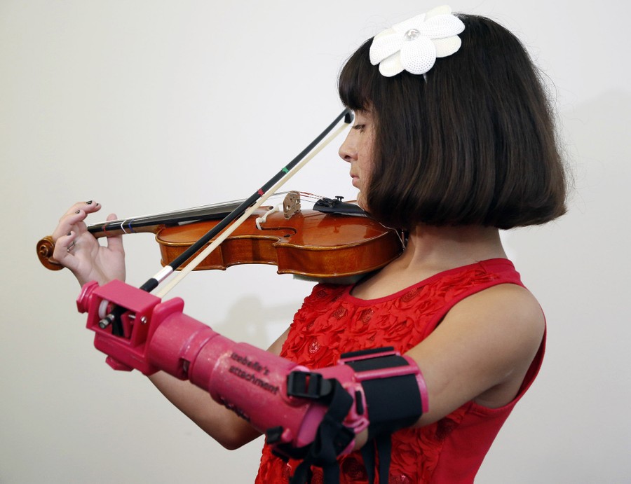 Read moreTen year old Isabella Nicola Cabrera plays her violin with her new prosthetic arm at the Engineering department of George Mason University in Fairfax, Virginia, on April 20, 2017. A group of five engineering students designed a new prosthetic for Isabel to use to play the violin. #