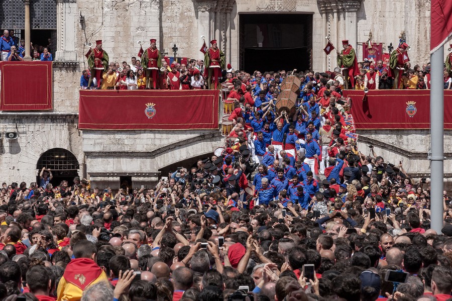 Read moreOne of the three Ceri, St. Giorgio, is carried into Piazza Grande prior the Alzata of the candles (Ceri) on May 15, 2017 in Gubbio, Italy. Gubbio's Race of the Candles festival dates back to the middle of the 12th century, a festival to express gratitude to Ubaldo, the then bishop of Gubbio, in celebration for victory in war. The Ceraioli who support the heavy Ceri (candles) wear colored shirts to represent their respective saint, yellow for St. Ubaldo, blue for St. Giorgio and black for St. Anthony. #