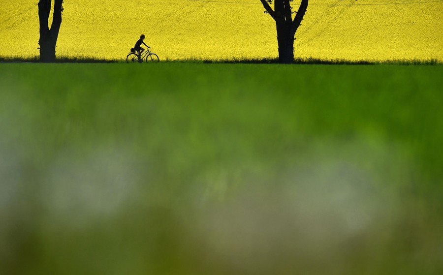 Read moreA cyclist drives past a flowering rapeseed field not far from the small Bavarian village of Schoengeising, near Munich, during a nice, warm sunny day on May 17, 2017. #