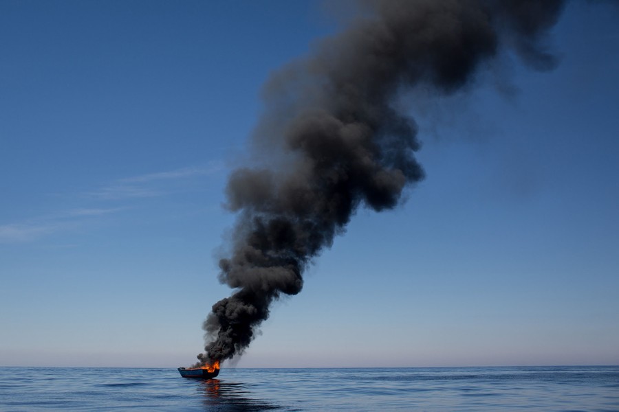 Read moreA small wooden boat used by refugees and migrants is seen burning after being set alight after all people were rescued by rescue crews from the Migrant Offshore Aid Station (MOAS) Phoenix vessel on May 18, 2017 in the Lampedusa, Italy. The numbers of refugees and migrants attempting the dangerous central Mediterranean crossing from Libya to Italy has risen since the same time last year with more than 43,000 people recorded so far in 2017. Since the start of the year MOAS have rescued and assisted 3,214 people and are currently patrolling and running rescue operations in international waters off the coast of Libya. #