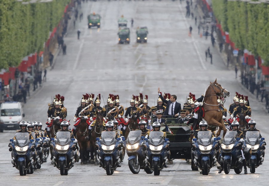 Read moreIn this photo dated May 14, 2017, a horse from the Republican Guard rears up as new French President Emmanuel Macron waves from a military vehicle while riding on the Champs Elysees avenue towards the Arc de Triomphe in Paris, France. #