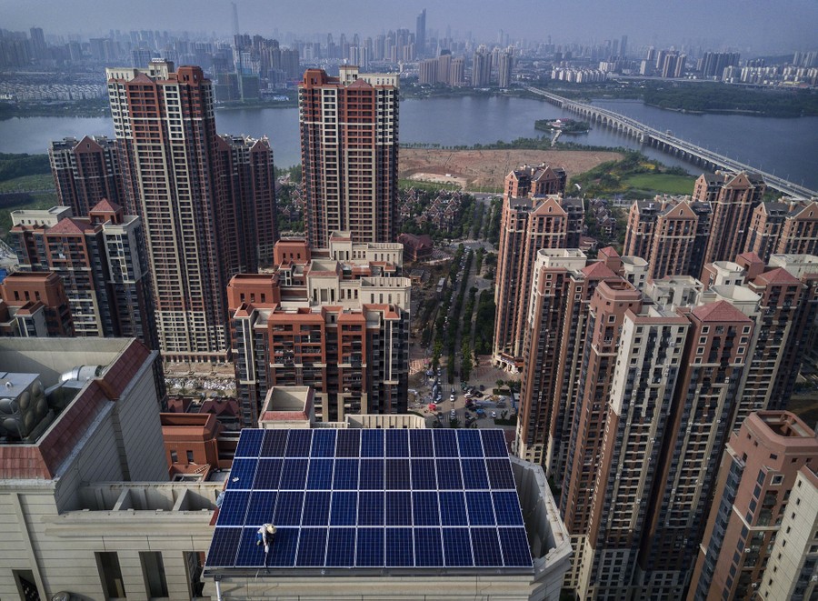 Read moreA Chinese worker from Wuhan Guangsheng Photovoltaic Company works on a solar panel project on the roof of a 47 story building in a new development on May 15, 2017 in Wuhan, China. China consumes more electricity than any other nation, but it is also the world's biggest producer of solar energy. Capacity in China hit 77 gigawatts in 2016 which helped a 50% jump in solar power growth worldwide. China is now home to two-thirds of the world's solar production, though capacity and consumption remain low relative to its population. Still, the country now buys half of the world's new solar panels Ñ which convert sunlight into energy, and are being installed on rooftops in cities and across sprawling fields in rural areas. Greenpeace estimates that by 2030, renewable energy could replace fossil fuels as China's primary source of power, a significant change in a country considered the world's biggest polluter. China's government has officially committed to development of renewable energies to ease the country's dependence on coal and other fossil fuels, though its strategic investments in the solar panel have created intense global competition. #