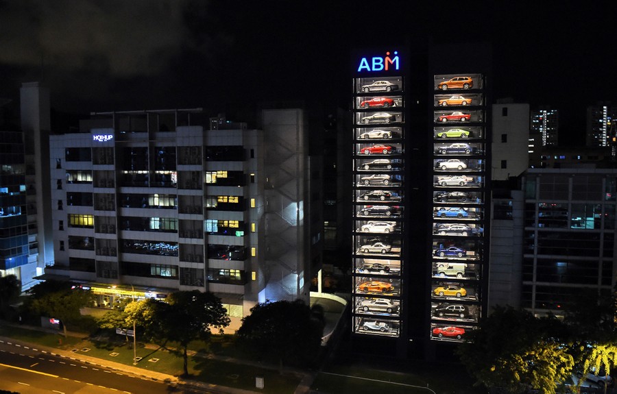 Read moreLuxury supercars are displayed inside the AutoBahn Motors (ABM) building in Singapore on May 18, 2017. The building, which resembles an automobile 'vending machine' houses 60 of the million-dollar supercars owned by ABM owners Gary and Jack Hong, who invented the Automotive Inventory Management System (AIMS). #