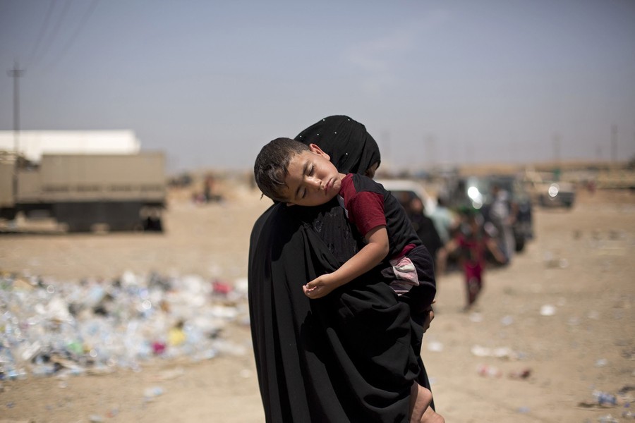 Read moreA child sleeps on his mother's shoulder after a perilous journey on foot to flee heavy fighting in their neighborhood between Iraqi forces and ISIS militants, at a processing center in west Mosul, Iraq, on May 18, 2017. #