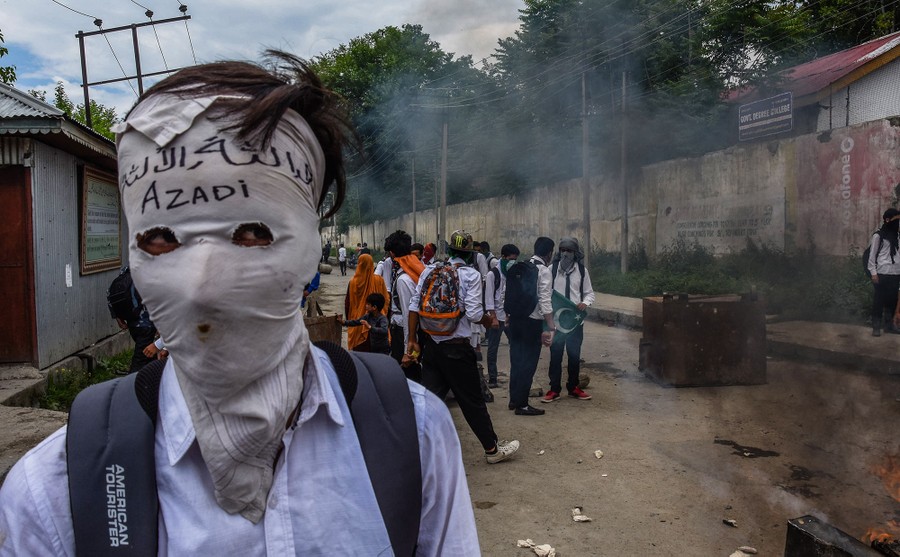 Read moreA masked Kashmiri student looks toward protesters during a fresh protest against the attack by Indian government forces on students on May 22, 2017, in Srinagar, the summer capital of Indian-administered Kashmir, India. The students have taken to streets and clashed with Indian government forces several times since an attack by Indian forces on a college in south Kashmir's Pulwama district last month. #