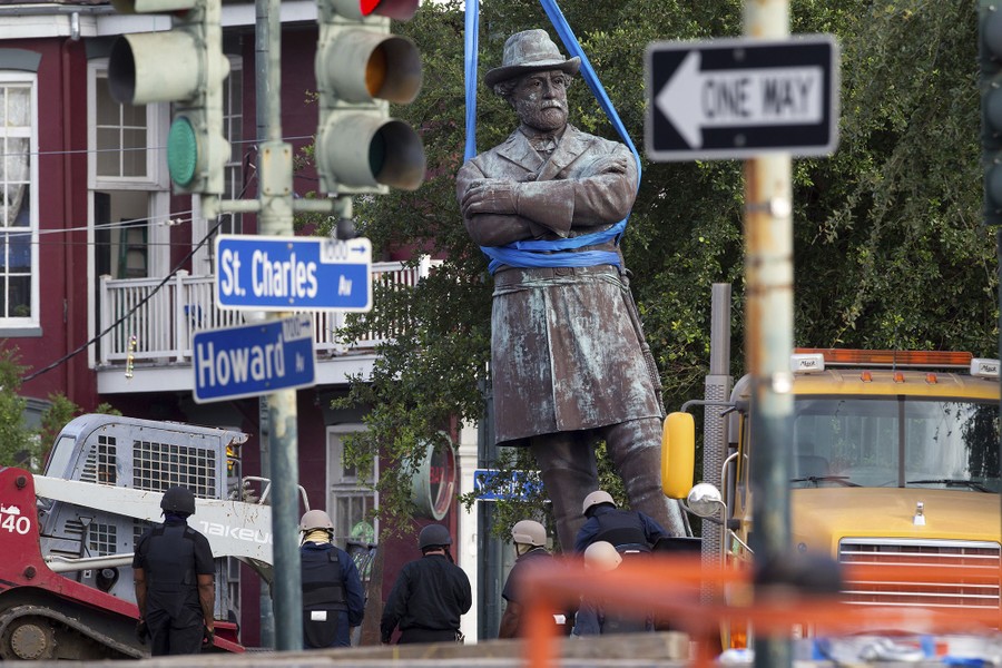 Read moreA statue of Confederate General Robert E. Lee is lowered to a truck for removal from Lee Circle in New Orleans on May 19, 2017. The city council voted to remove the monument and three other Confederate and white-supremacist monuments in December of 2015. #