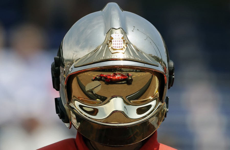Read moreThe Ferrari driver Kimi Raikkonen of Finland is reflected in a firefighter helmet visor as he steers his car during the second free practice at the Formula One Grand Prix at the Monaco racetrack in Monaco on May 25, 2017. #