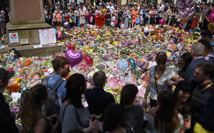 Read morePeople stop by a mass of flowers to observe a minute's silence in Saint Ann's Square in Manchester, England, on May 25, 2017, as a mark of respect to the victims of the May 22 terror attack at Manchester Arena. Police said they arrested two men Thursday in the Manchester area in connection with the deadly bombing of an Ariana Grande pop concert, while a detained woman was released without charges. Britain raised its terror alert to the maximum level and ordered troops to protect strategic sites after 22 people were killed in a suicide bomb attack on a Manchester pop concert. #