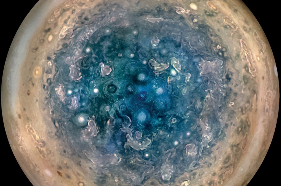 Read moreJupiter’s south pole, as seen by NASA’s Juno spacecraft from an altitude of 32,000 miles (52,000 kilometers). The oval features are cyclones, up to 600 miles (1,000 kilometers) in diameter. Multiple images taken with the JunoCam instrument on three separate orbits were combined to show all areas in daylight, enhanced color, and stereographic projection. #