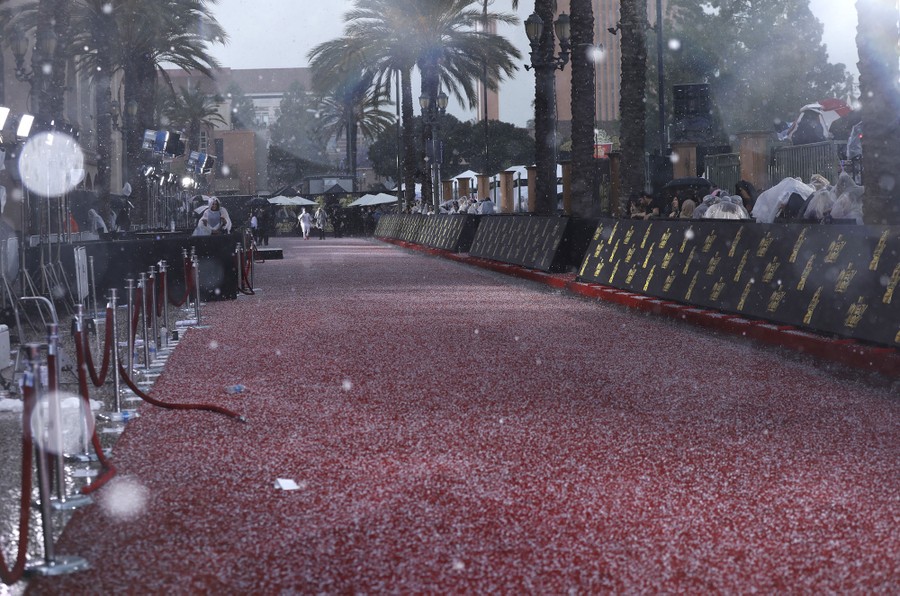 Read moreThe red carpet at the arrivals area of the 2017 MTV Movie and TV Awards ceremony is covered by hailstones following a storm, forcing the ceremony to move indoors, in Los Angeles, California, on May 7, 2017. #