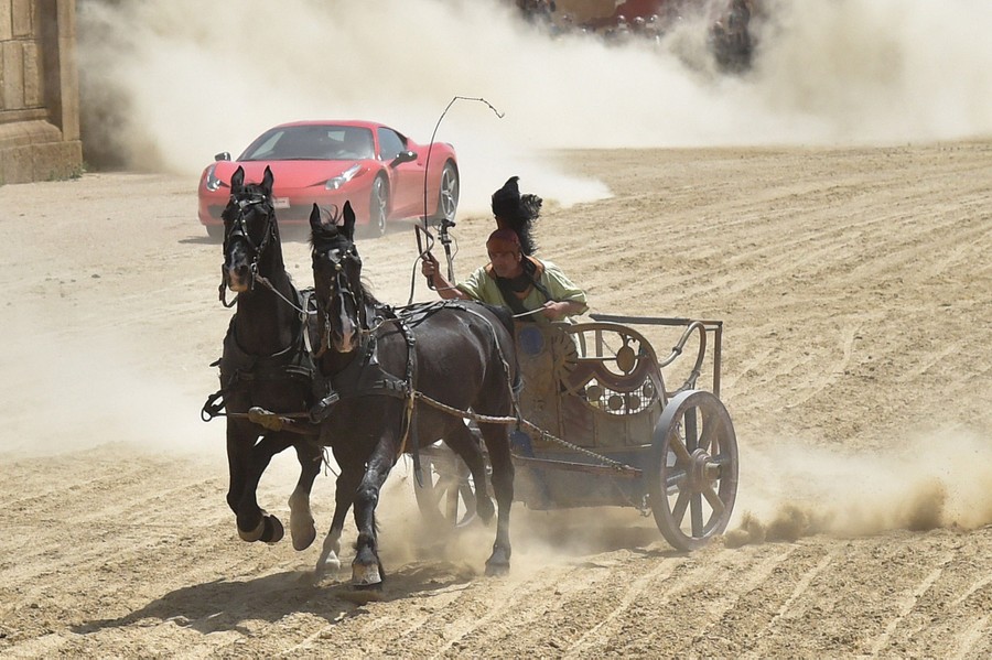 Read moreFerrari driver Fabio Barone steers his Ferrari 458 Italia during a race against a Roman chariot drawn by two horses on the "Ben Hur" movie set at Cinecitta World amusement park on May 11, 2017 in Castel Romano near Rome. #