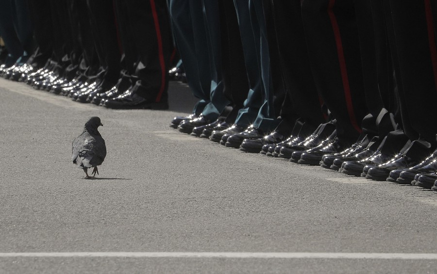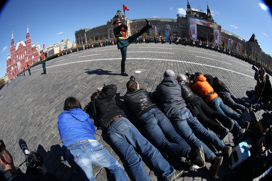 Read morePress photographers take a photo lying on the stone blocks of the Red Square during a rehearsal of the Victory Day military parade on May 7, 2017, in Moscow, Russia. #
