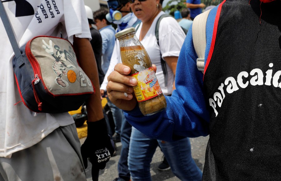 Read moreOpposition supporters rally against President Nicolas Maduro with a bottle filled with feces, called "Poopootovs", which is a play on Molotov cocktails, before throwing it at security forces during protests, in addition to the usual rocks and petrol bombs, in Caracas, Venezuela, on May 10, 2017. #