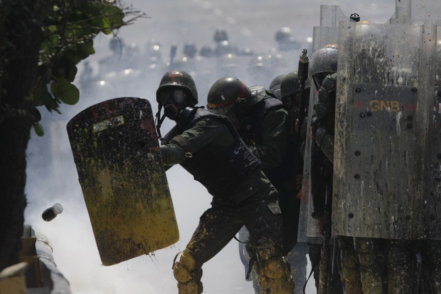 Read moreIn this May 10, 2017 photo, Bolivarian National Guards shield themselves from a jar of fecal matter thrown at them by anti-government protesters in Caracas, Venezuela. #