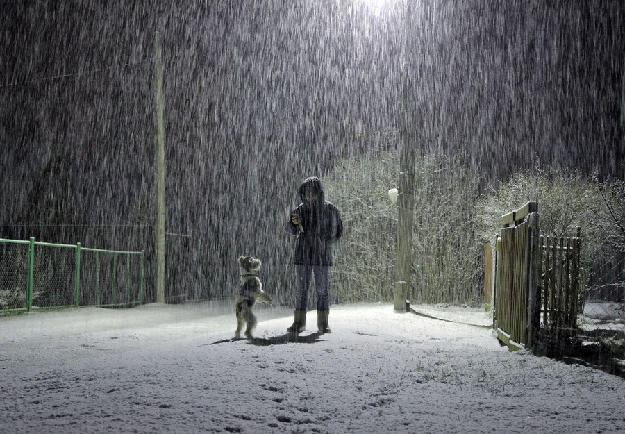 Read moreA woman walks with her dog in snowfall in Podolye village, 70 km (43 miles) east of St. Petersburg, Russia, on May 11, 2017. North winds brought snow to the east of the St.Petersburg region. #