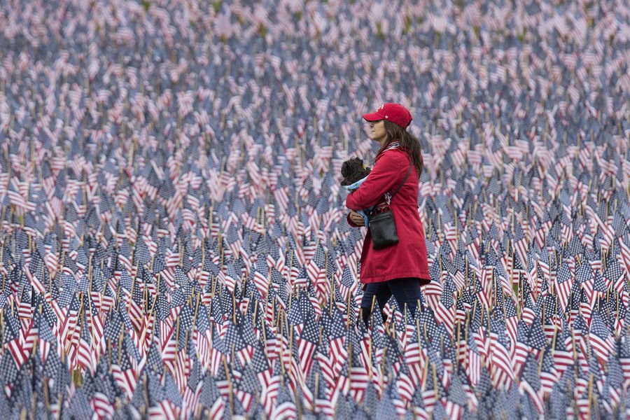 Read moreA woman holding a dog walks past the 37,252 flags placed on the Boston Common to honor the number of lost Massachusetts military members on May 29, 2017 in Boston, Massachusetts. In an annual tradition, volunteers plant tens of thousands of flags on the Boston Common for Memorial Day. #