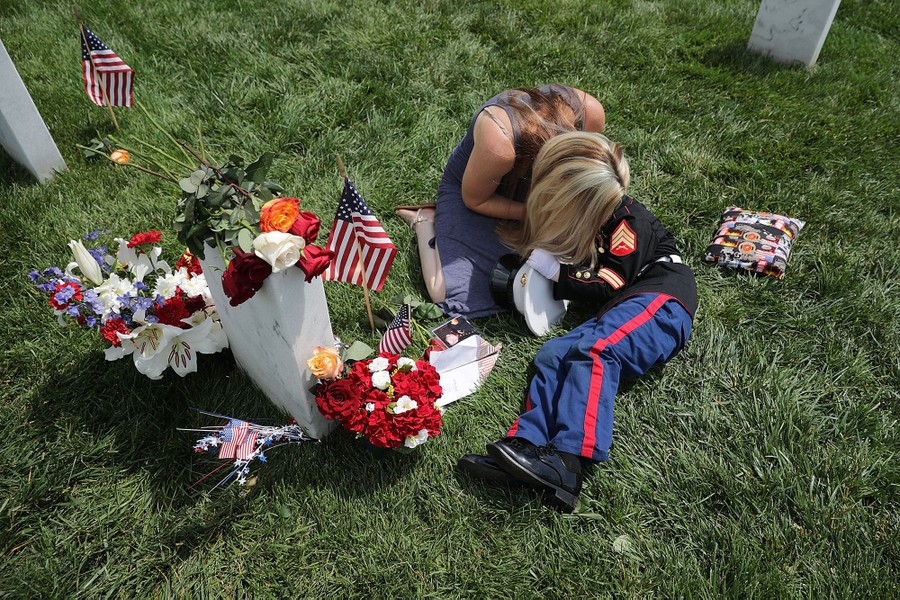 Read moreBrittany Jacobs of Hertford, North Carolina, embraces her son, Christian Jacobs, 6, while sitting next to the grave of her husband, U.S. Marine Corps Sgt. Chris Jacobs, in Section 60 at Arlington National Cemetery on Memorial Day May 29, 2017 in Arlington, Virginia. Part of the 3rd Assault Amphibian Battalion, 1st Marine Division, Sgt. Jacobs served in Afghanistan and Iraq and was killed during a training exercise in California in 2011. #