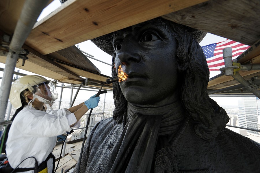 Read moreEliot Bassett-Cann, with Moorland Studios, applies a protective coating to the sculpture of William Penn atop City Hall in Philadelphia, Pennsylvania, on June 1, 2017. The 37-foot bronze sculpture by Alexander Milne Calder has been atop City Hall for 125 years. The sculpture's conservation project happens every ten years and takes four to five weeks to complete. #