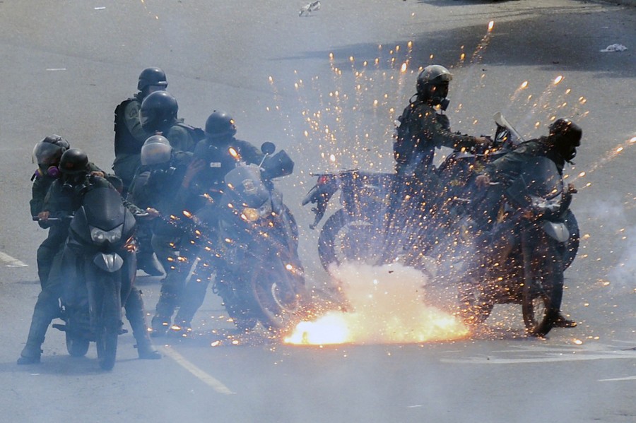 Read moreA firework launched by opposition activists explodes amid a group of National Guard riot police motorcyclists during a protest against President Nicolas Maduro's government, in Caracas on May 31, 2017. #
