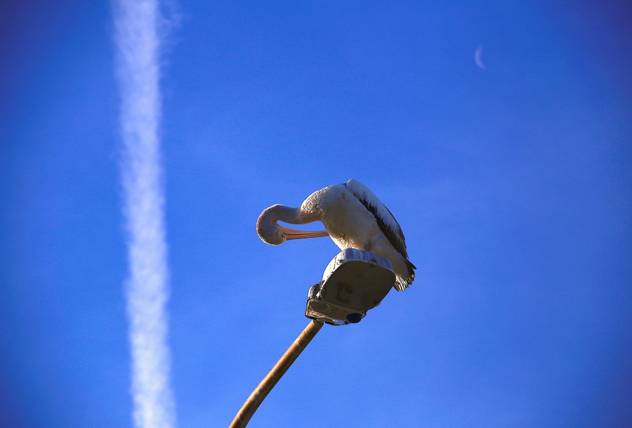 Read moreA plane's trail and the moon can be seen behind a Pelican, Australia's largest flying bird, as it cleans itself atop a street light on an Autumn day in the northern beaches suburb of Narrabeen in Sydney, Australia, on May 30, 2017. #